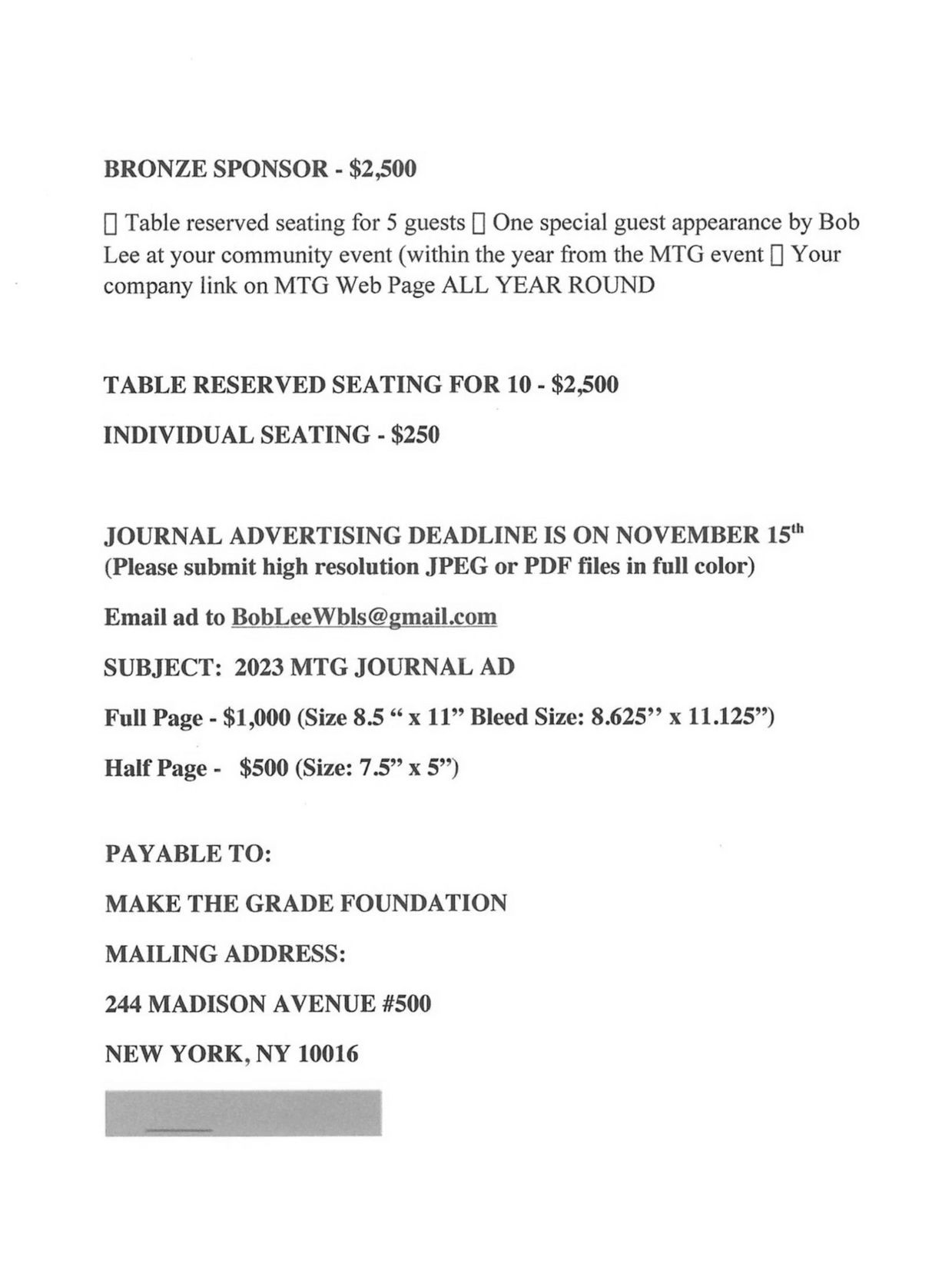 Make The Grade Foundation is a 501(c)3 non-profit organization that facilitates and encourages academic achievement by implementing programs to tutor, mentor, motivate and provide incentives to students. Proceeds from the gala will benefit Make The Grade Foundation. We appreciate your continued support. We humbly solicit your partnership in these endeavors. Sponsorship opportunities are listed, which will explain the participation levels in more detail.